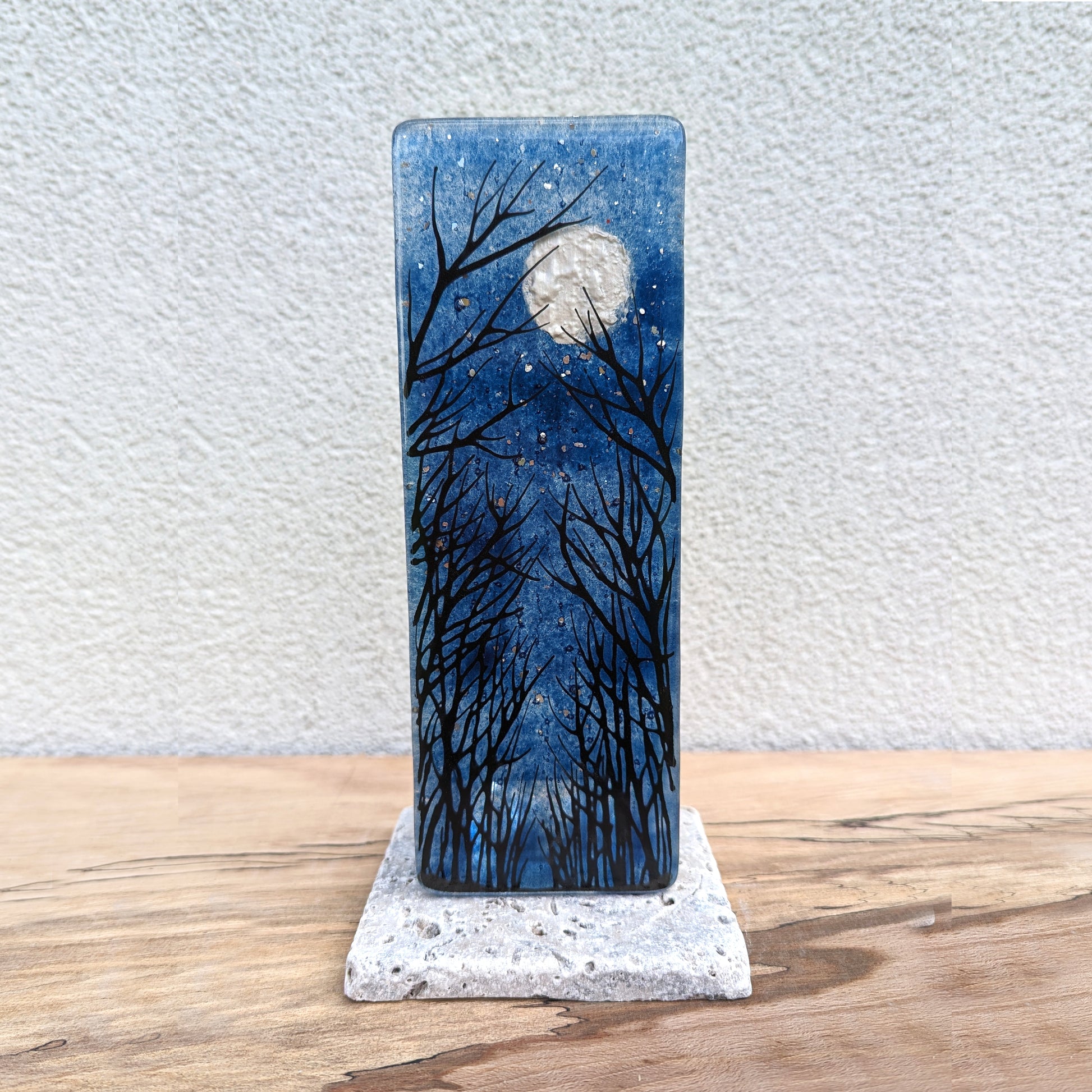 Hand drawn tree image on clear glass. Incorporating blue coloured glass powders, Silver Mica and glitter. Grinded edges for a smooth touch and sandblasted for a frosted effect on the back. A clear candle holder is fixed to the back and then fixed to a tile base.