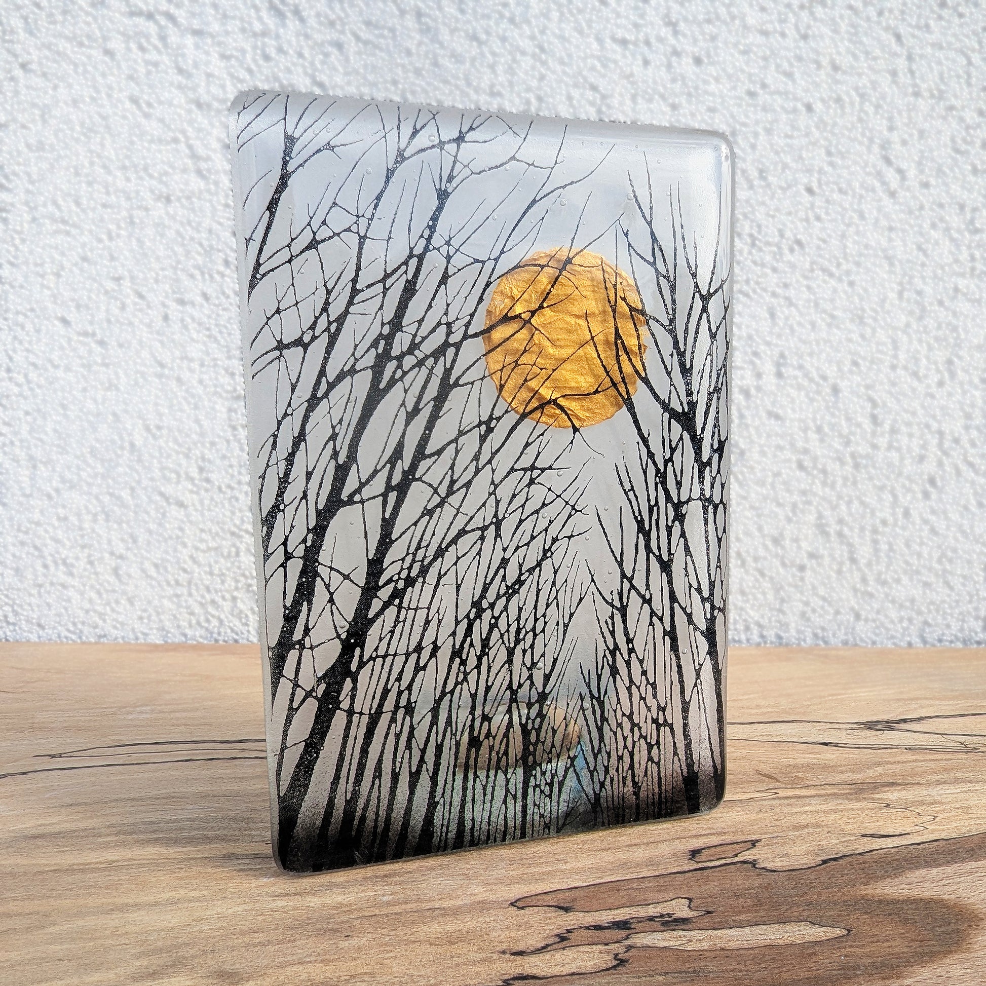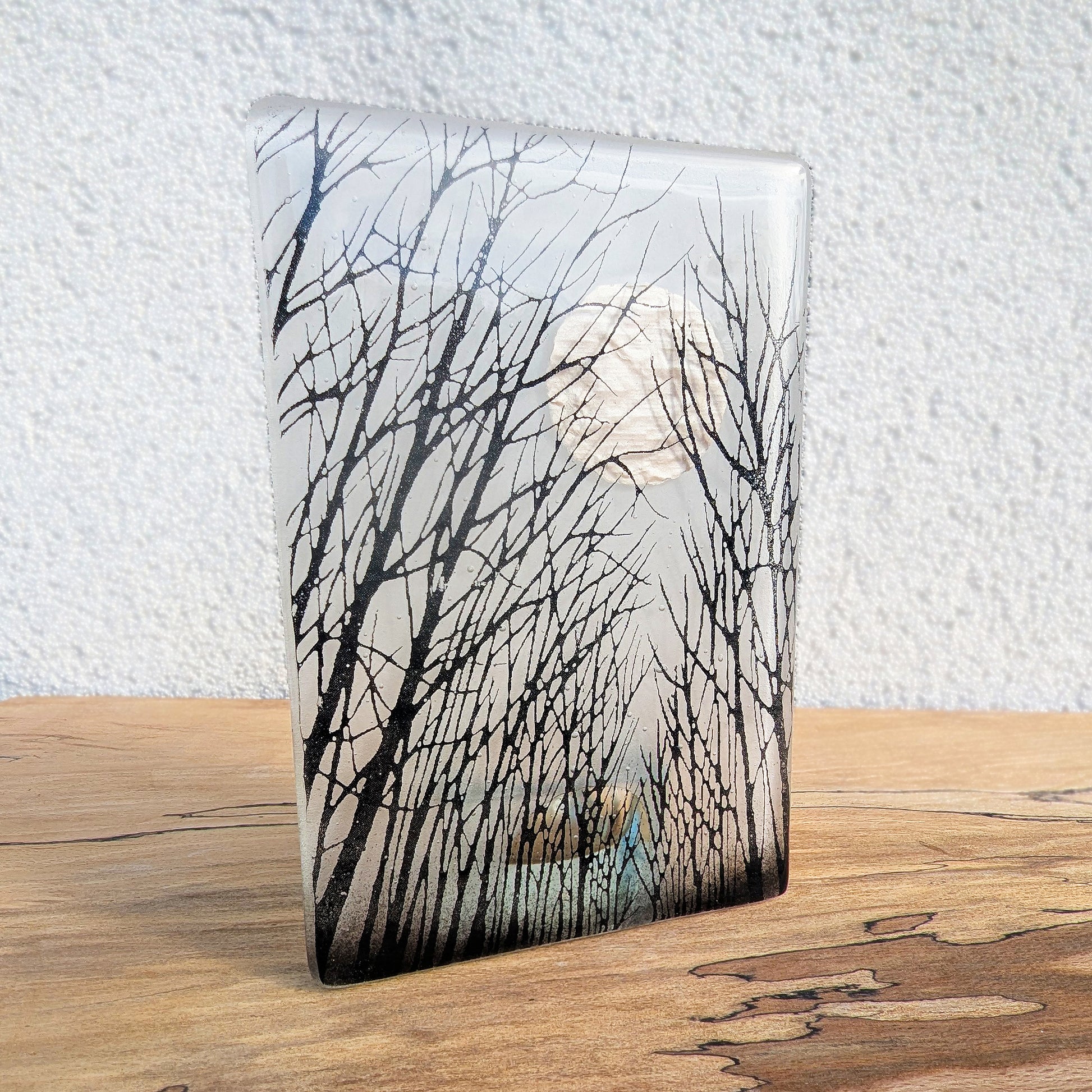 Hand drawn black tree image on a transparent clear glass. Incorporating a round mica moon and black glass powders. Grinded edges for a smooth touch and sandblasted on the back for a frosted effect. A clear candle holder is fixed to the back.