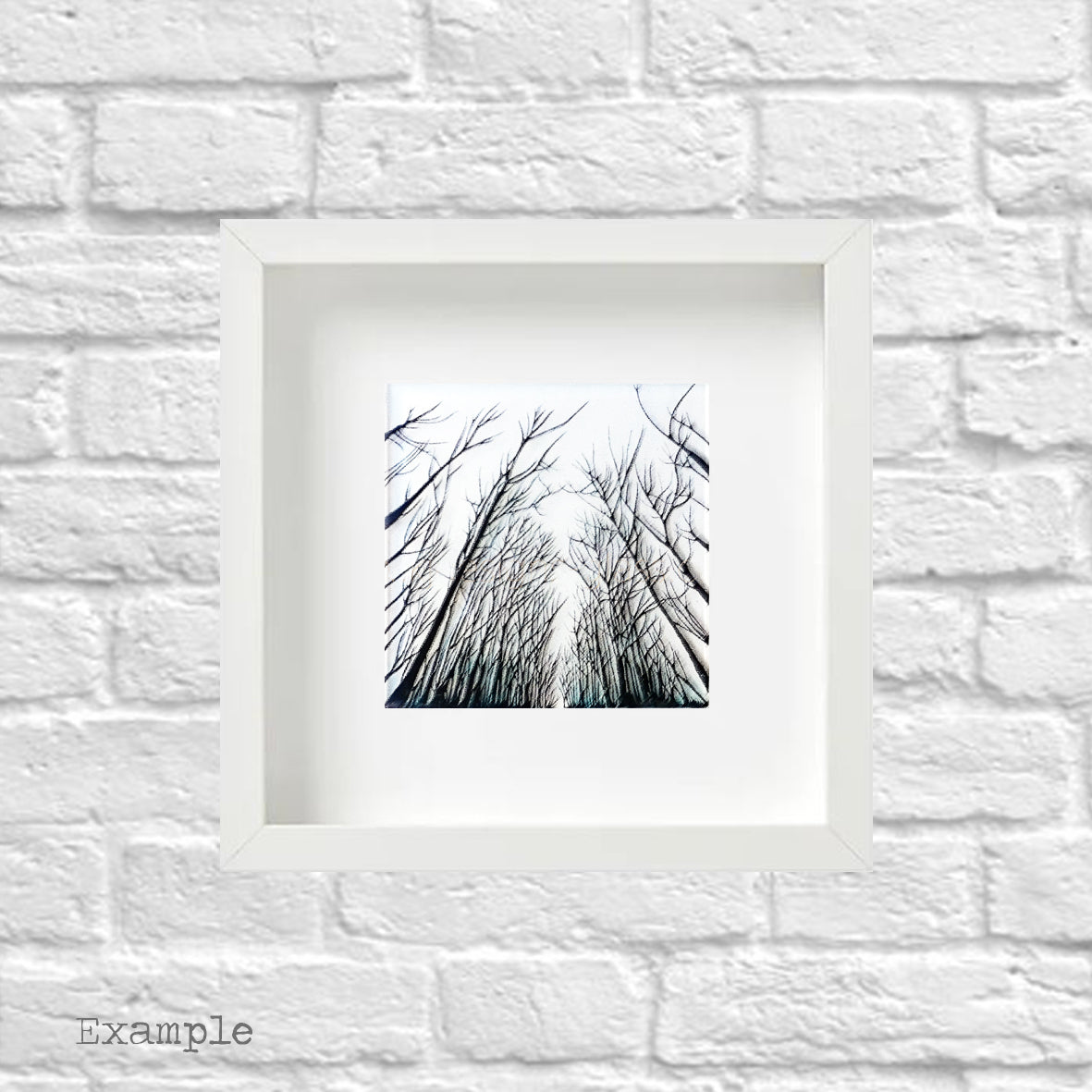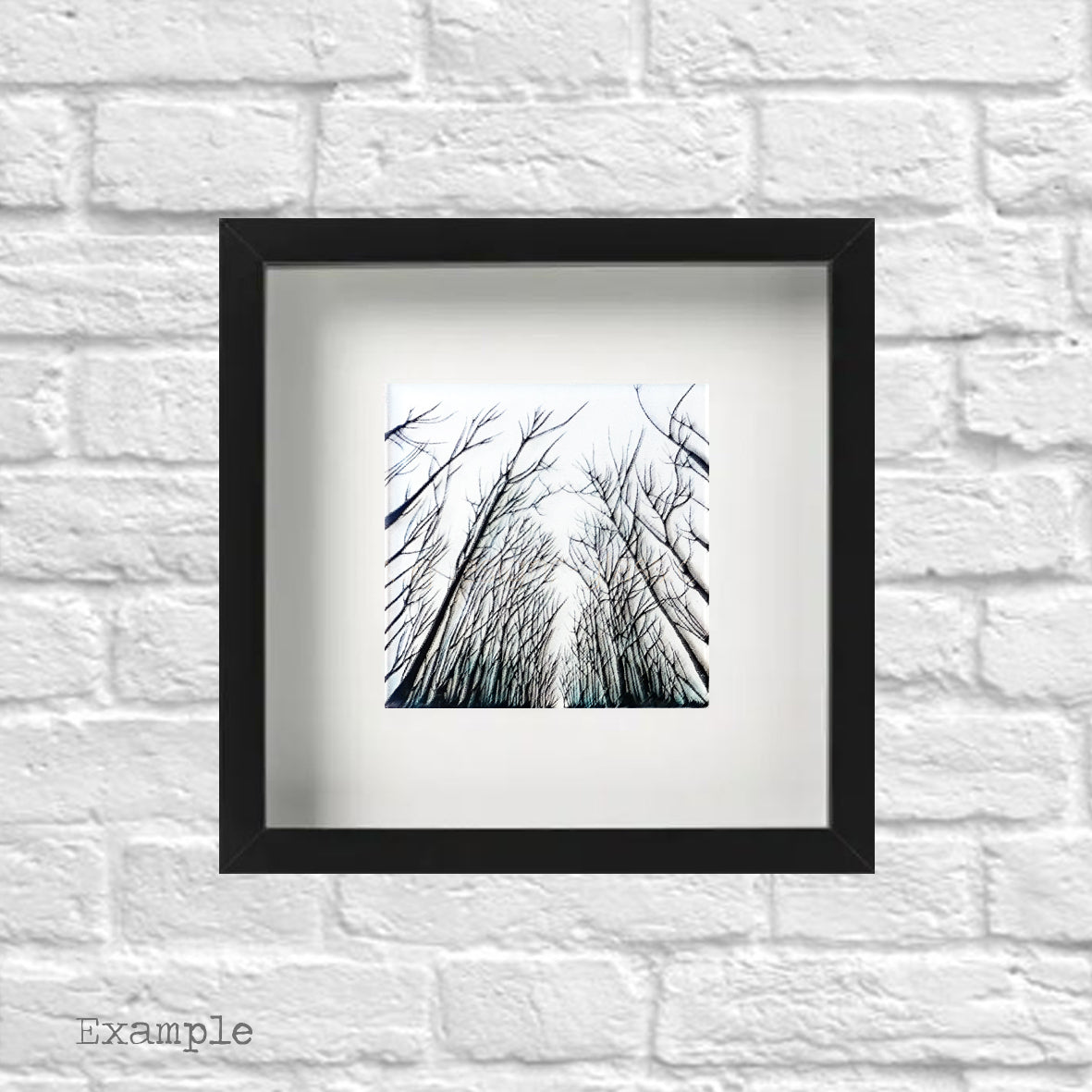 Enough coloured glass powders are incorporated to create an opaque image. The glass is sandblasted on the back with ground edges for a smooth touch. The fused glass is securely fixed to a backing glass fitting the frame, you will not see any specialised adhesive used. Frame 23x 23cm, fused glass piece approx 15x 15cm.