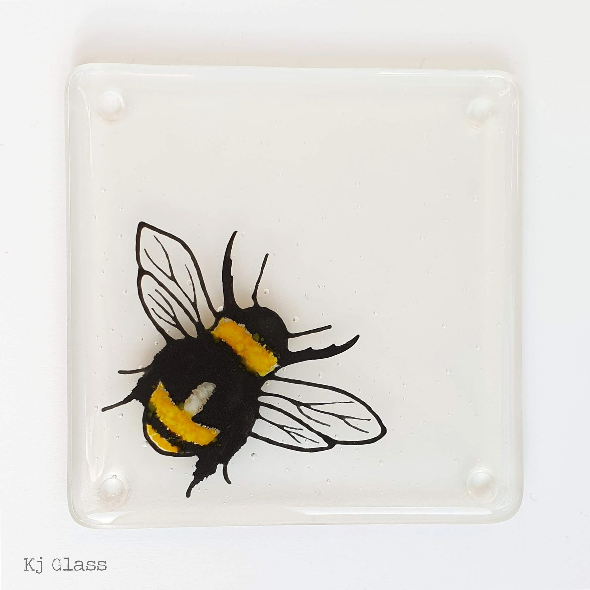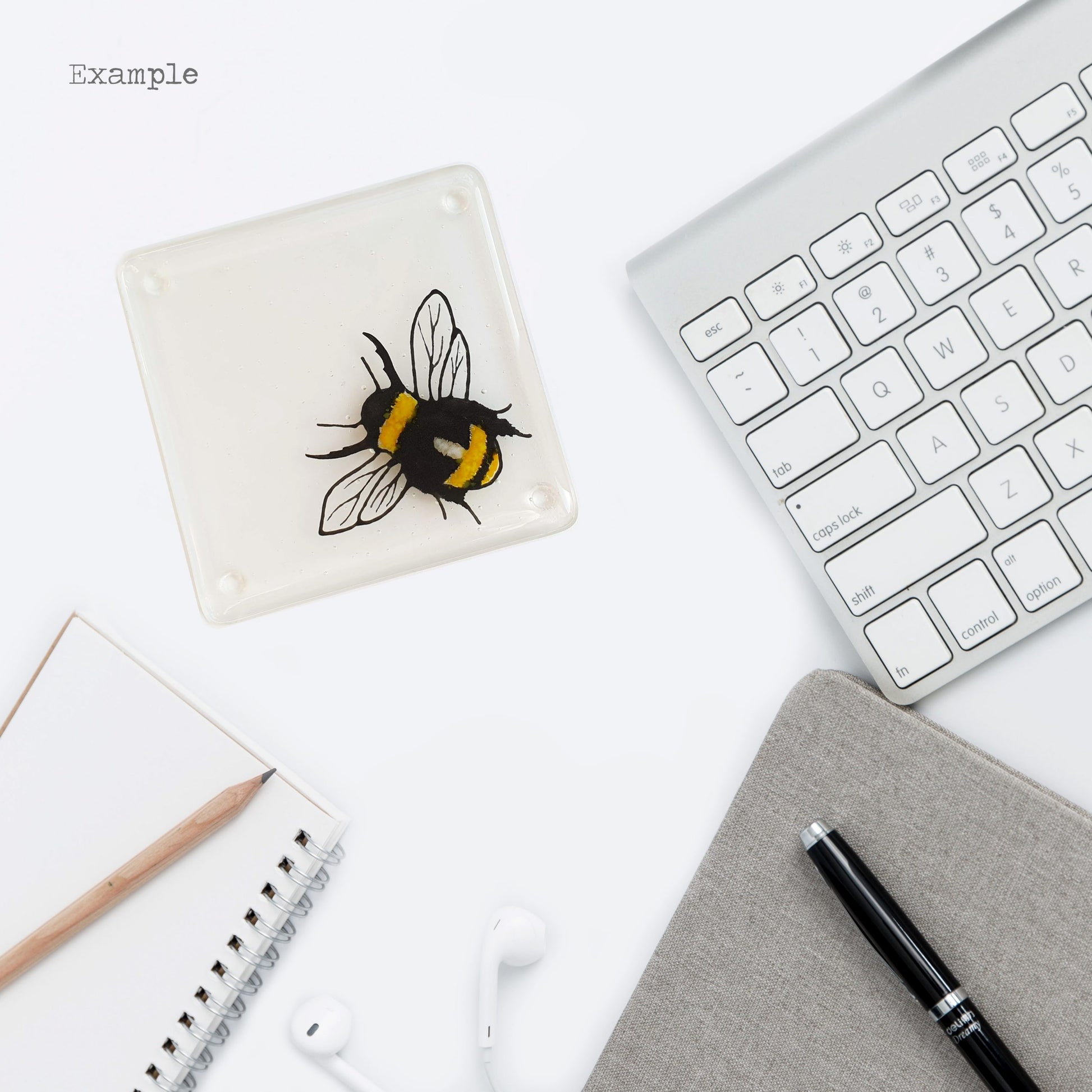 A hand drawn Bumble Bee on clear specialised glass incorporating coloured glass powders. The glass is sandblasted on the back with ground edges for a smooth touch. Comes complete with those all important bumpers to protect any surface. Due to bumpers this product is not ideal for dishwashers. Hand washing is advised. (Single coaster)