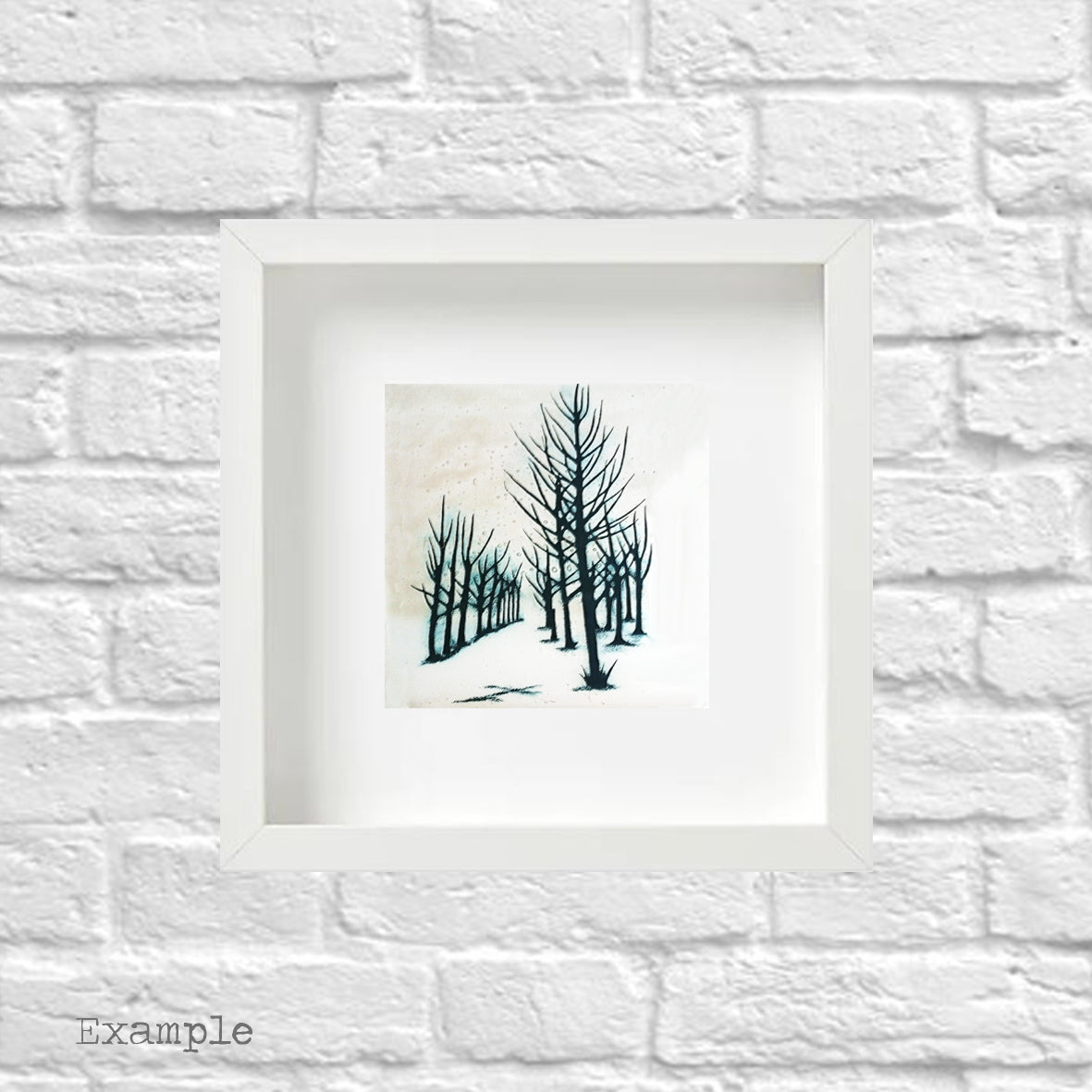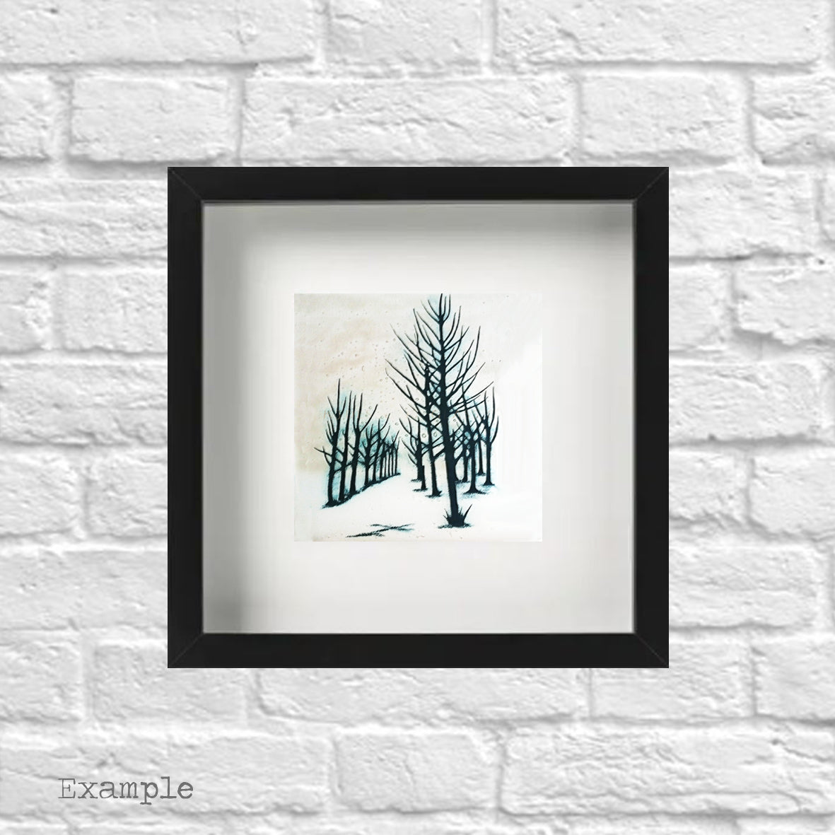Enough coloured glass powders are incorporated to create an opaque image. The glass is sandblasted on the back with ground edges for a smooth touch. The fused glass is securely fixed to a backing glass fitting the frame, you will not see any specialised adhesive used. Frame 23x 23cm, fused glass piece approx 15x 15cm.