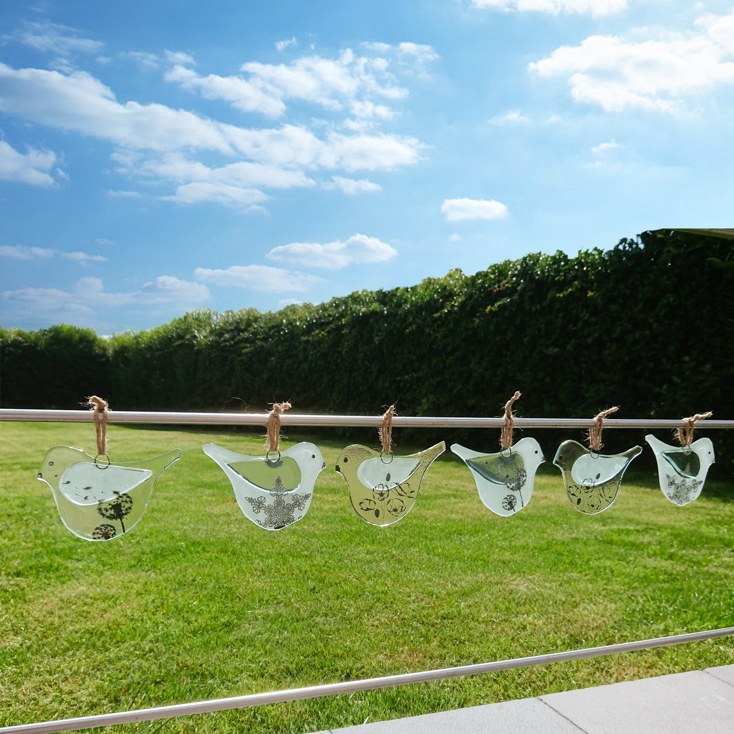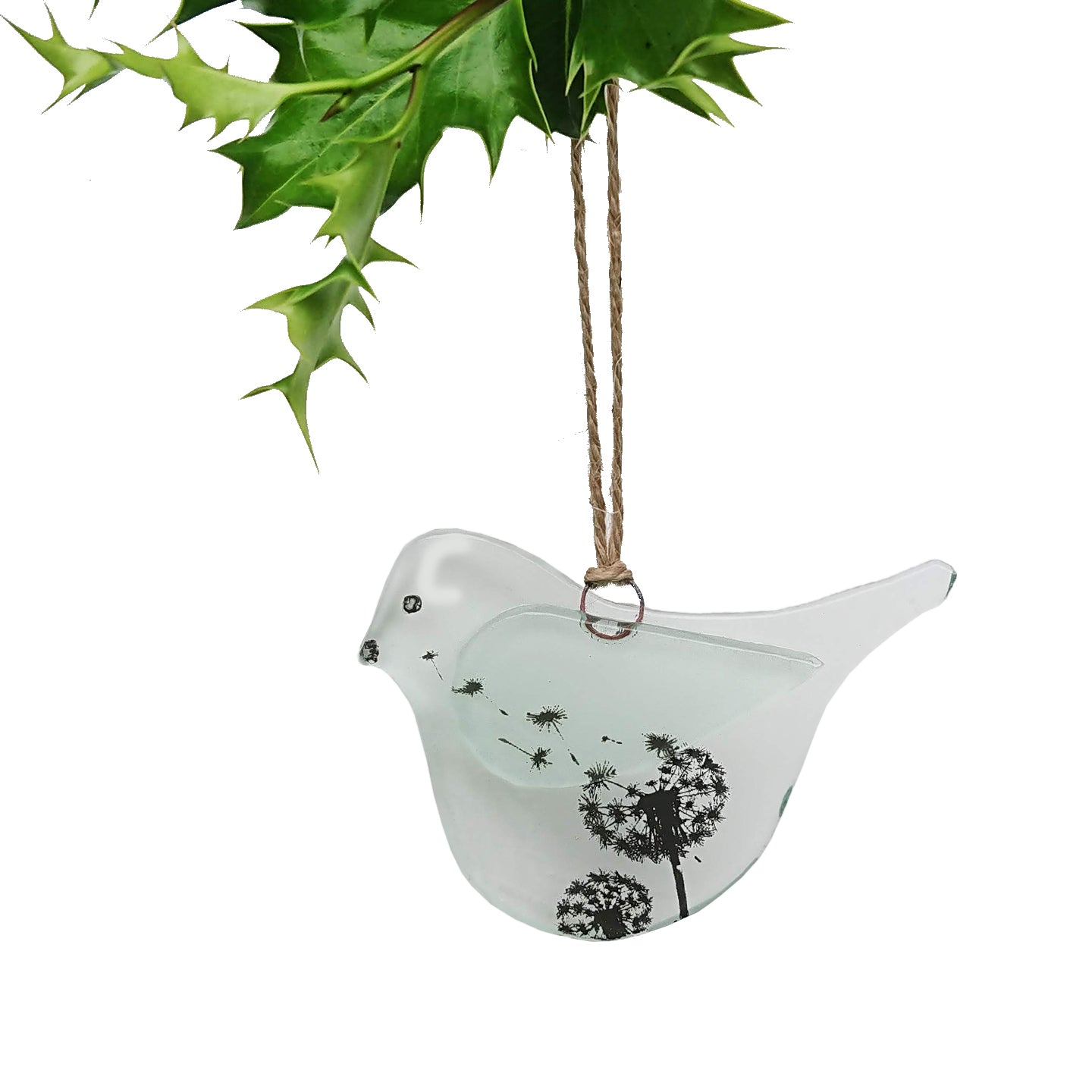 The glass wing is sandblasted on the back with ground edges for a smooth touch. The trapped copper hook is visible. Glass birdie examples have been tested in a freezer for over a week to test cold weather conditions and have survived without any breakages. If you would rather it wasn't sandblasted in parts or indeed it was sandblasted all over, this can certainly be done, simply get in touch and we will be happy to help.