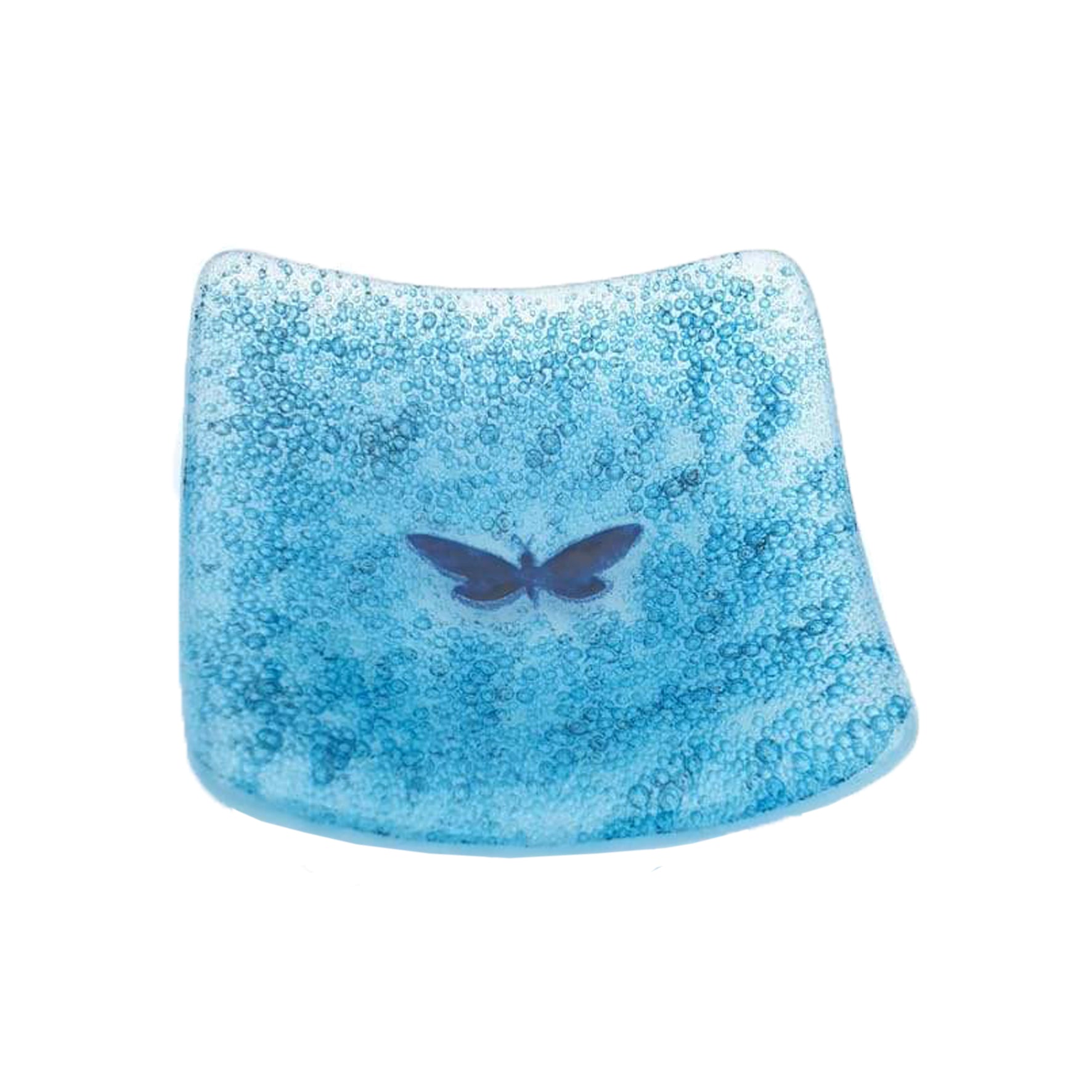 Specialised glass trapping copper oxide creating tiny blue bubbles incorporating a simple blue glass powder Butterfly. The glass is sandblasted on the back with ground edges for a smooth touch. The butterfly only can be commissioned to any colour scheme.