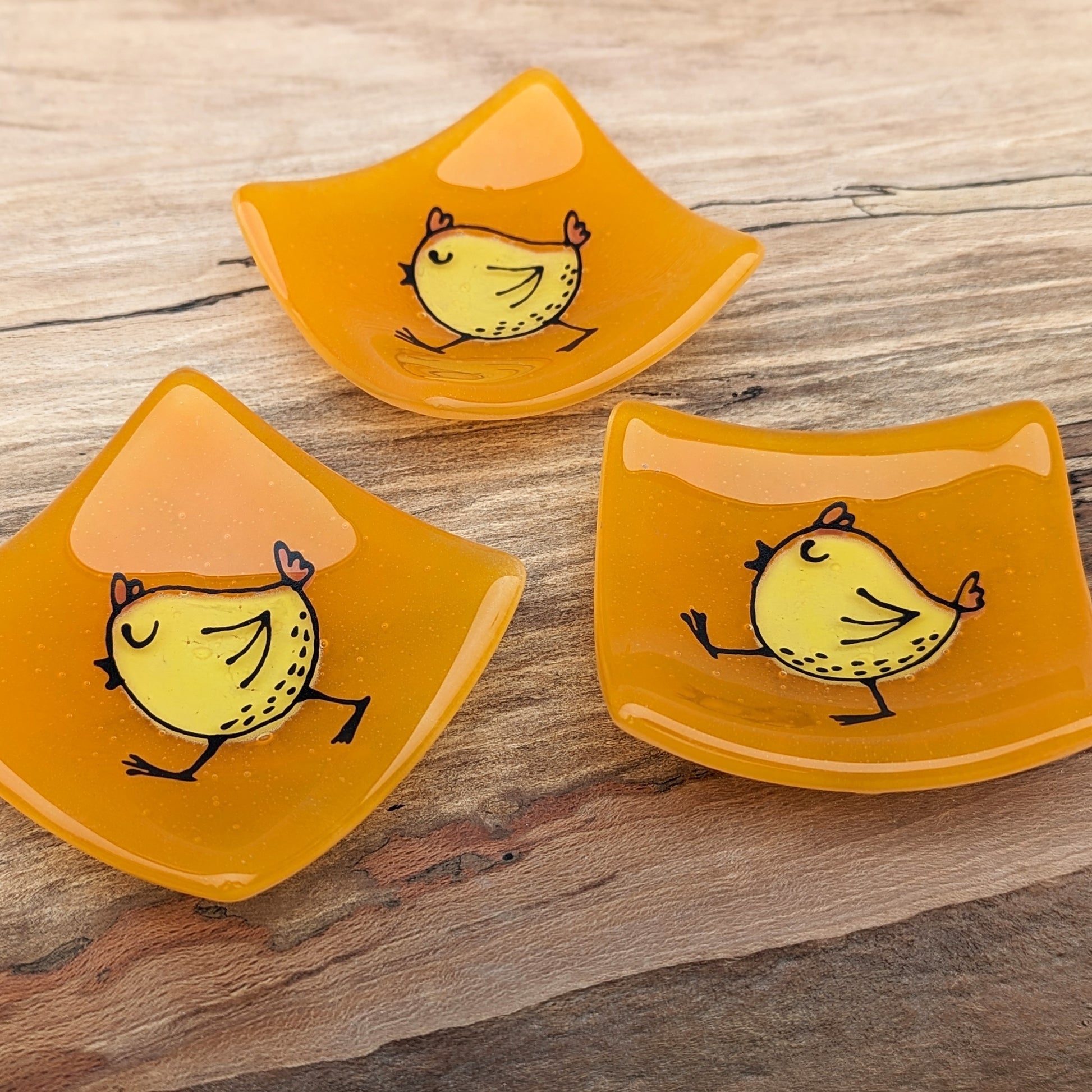 Specialised glass incorporating a simple hand drawn image of a Chick and orange coloured powders. The glass is sandblasted on the back with ground edges for a smooth touch. This item can be commissioned to any colour scheme.