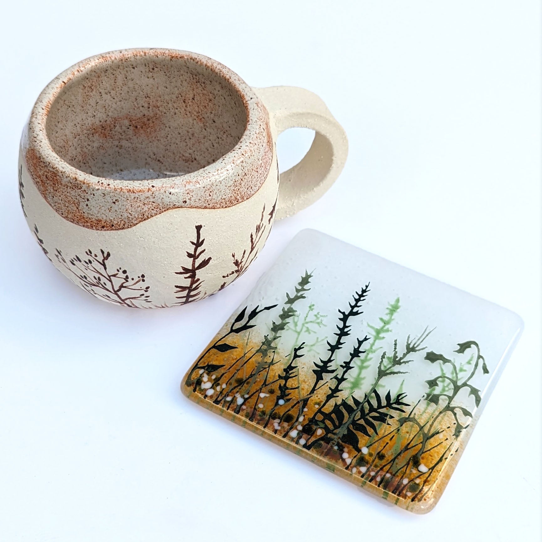 Make and decorate a hand built ceramic mug, and two fused glass coasters.