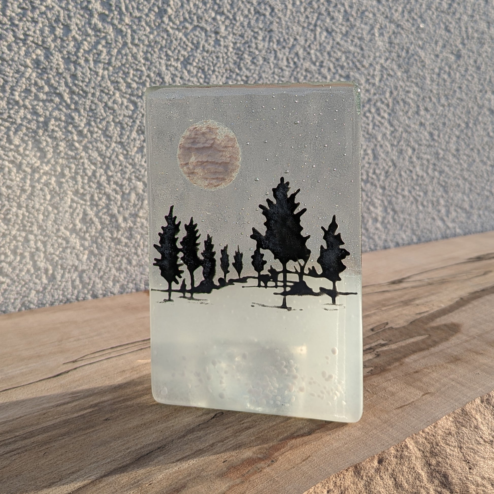 Hand drawn black tree image on a transparent blue or clear glass. Incorporating a round mica moon and white glass powders. Grinded edges for a smooth touch and sandblasted along the base. A clear candle holder is fixed to the back.