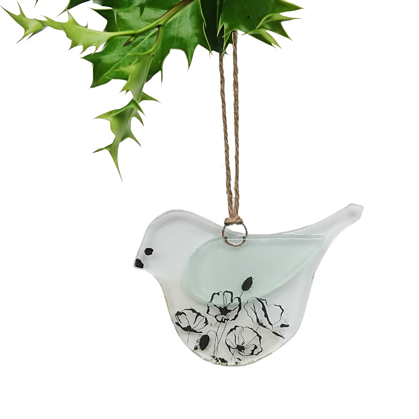 The glass wing is sandblasted on the back with ground edges for a smooth touch. The trapped copper hook is visible. Glass birdie examples have been tested in a freezer for over a week to test cold weather conditions and have survived without any breakages. If you would rather it wasn't sandblasted in parts or indeed it was sandblasted all over, this can certainly be done, simply get in touch and we will be happy to help.