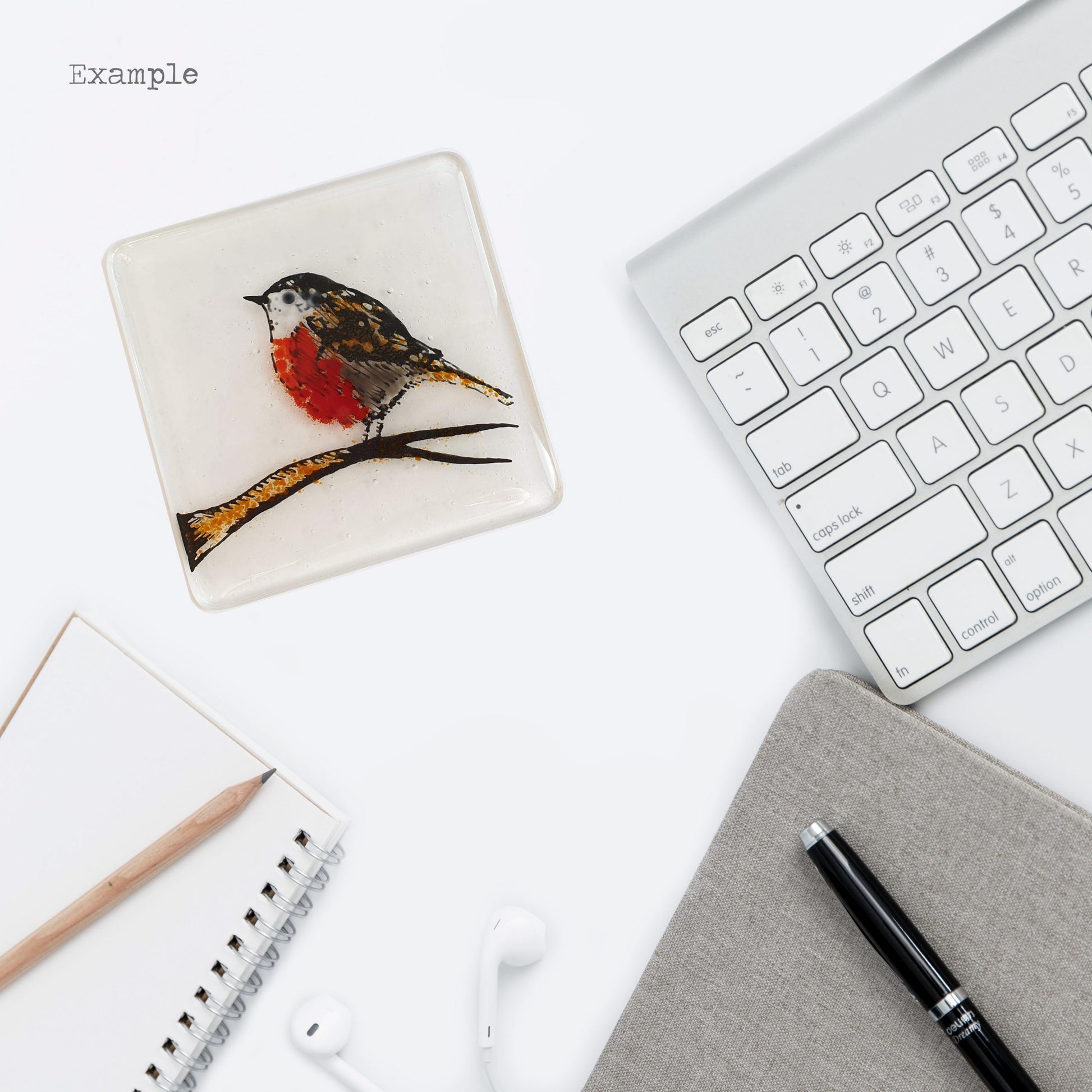 A hand drawn Robin on clear specialised glass incorporating coloured glass powders. The glass is sandblasted on the back with ground edges for a smooth touch. Comes complete with those all important bumpers to protect any surface. Due to bumpers this product is not ideal for dishwashers. Hand washing is advised. (Single coaster)