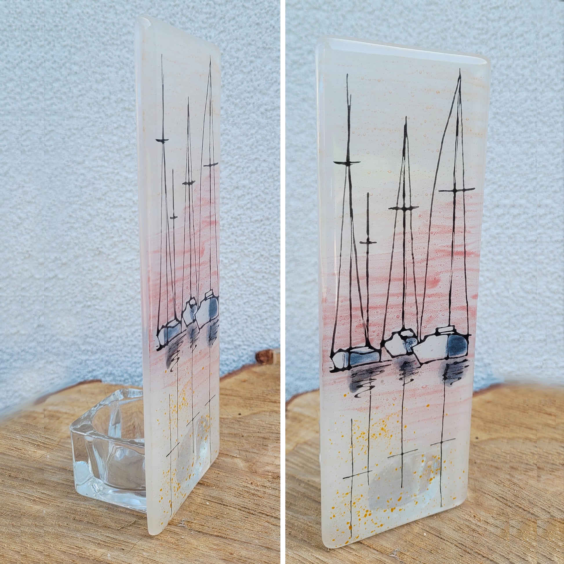Hand drawn sailing boat image on clear glass. Incorporating coloured glass powders and frits. Grinded edges for a smooth touch and sandblasted for a frosted effect on the back. A clear candle holder is fixed to the back and then fixed to a tile base.