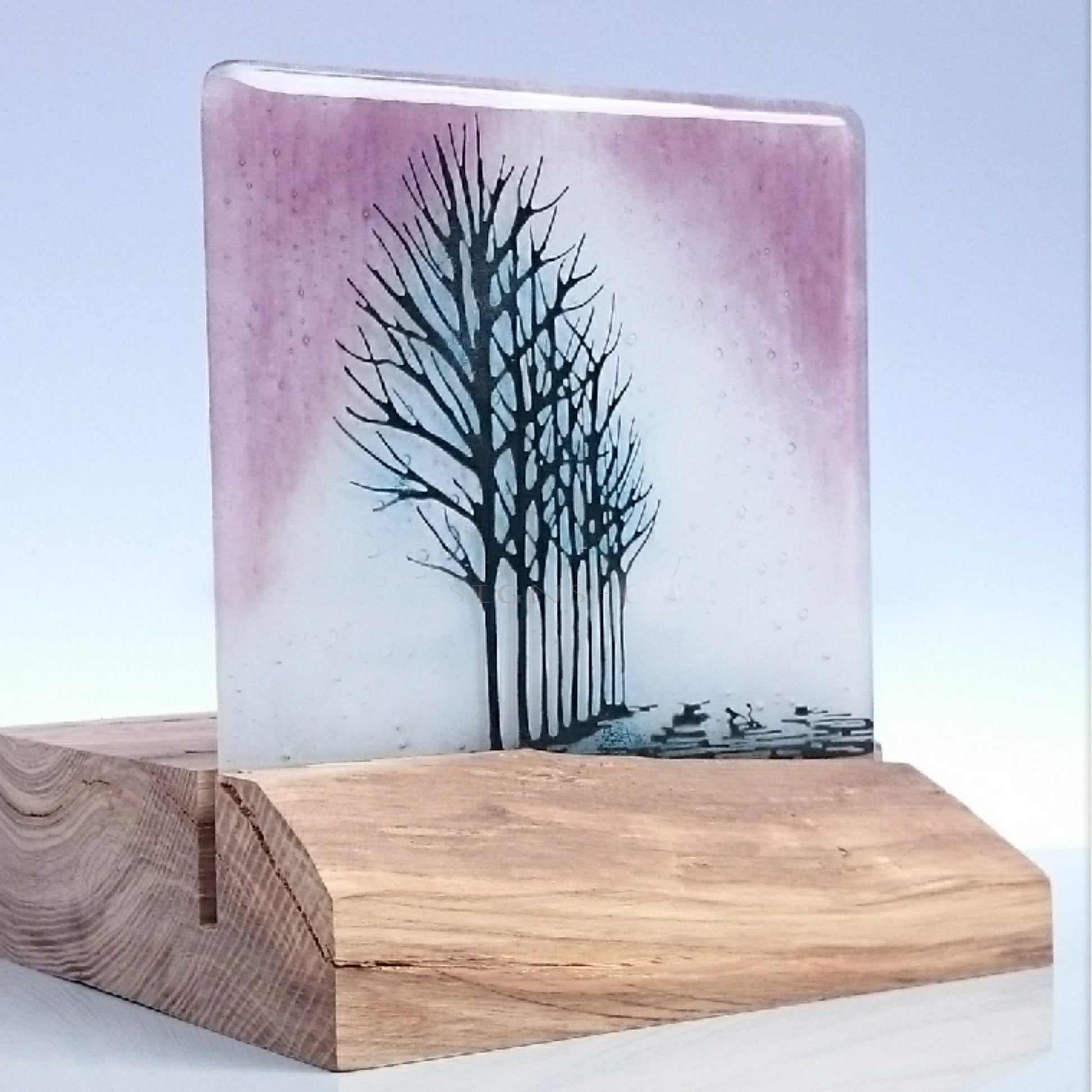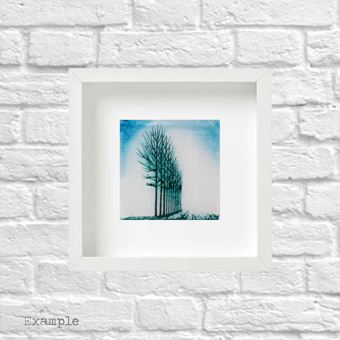 Enough coloured glass powders are incorporated to create an opaque image. The glass is sandblasted on the back with ground edges for a smooth touch. The fused glass is securely fixed to a backing glass fitting the frame, you will not see any specialised adhesive used. Frame 23x 23cm, fused glass piece approx 15x 15cm.