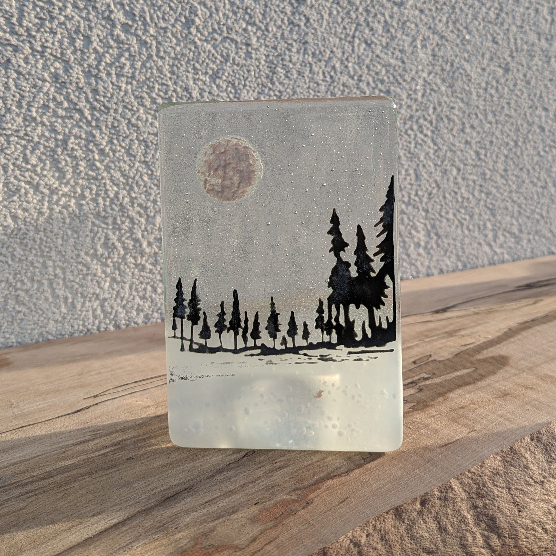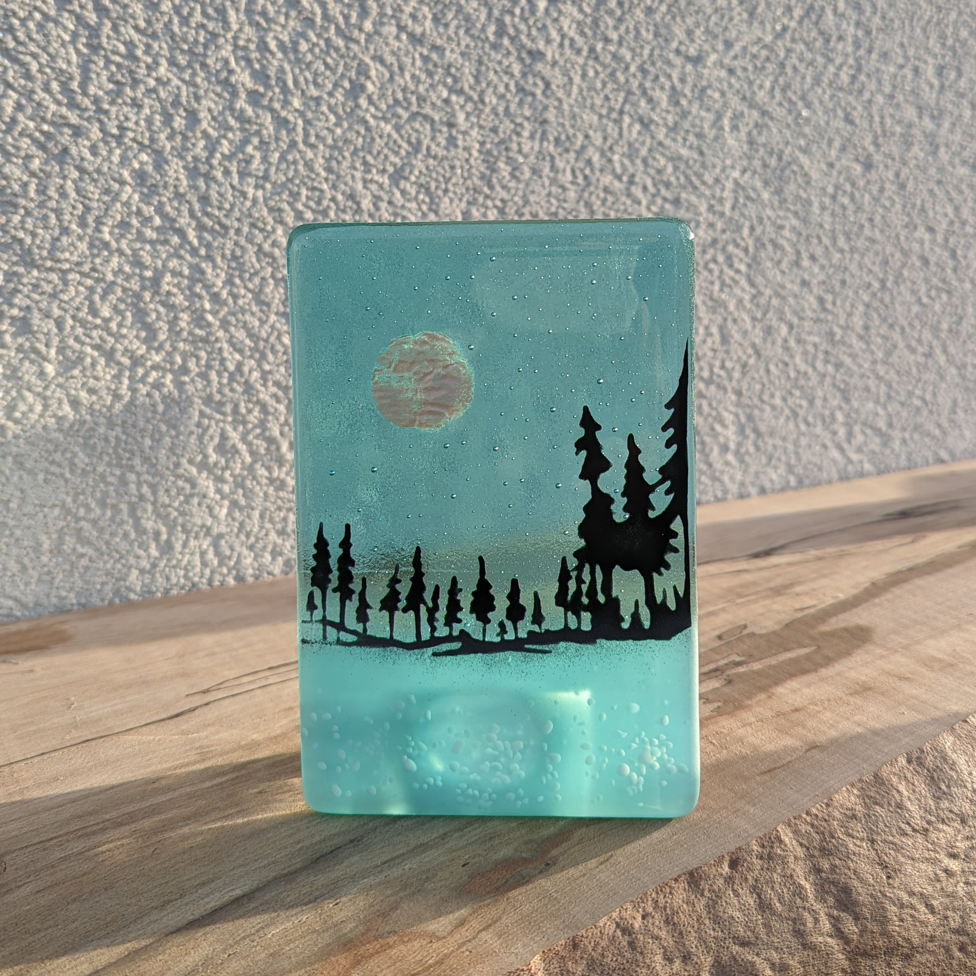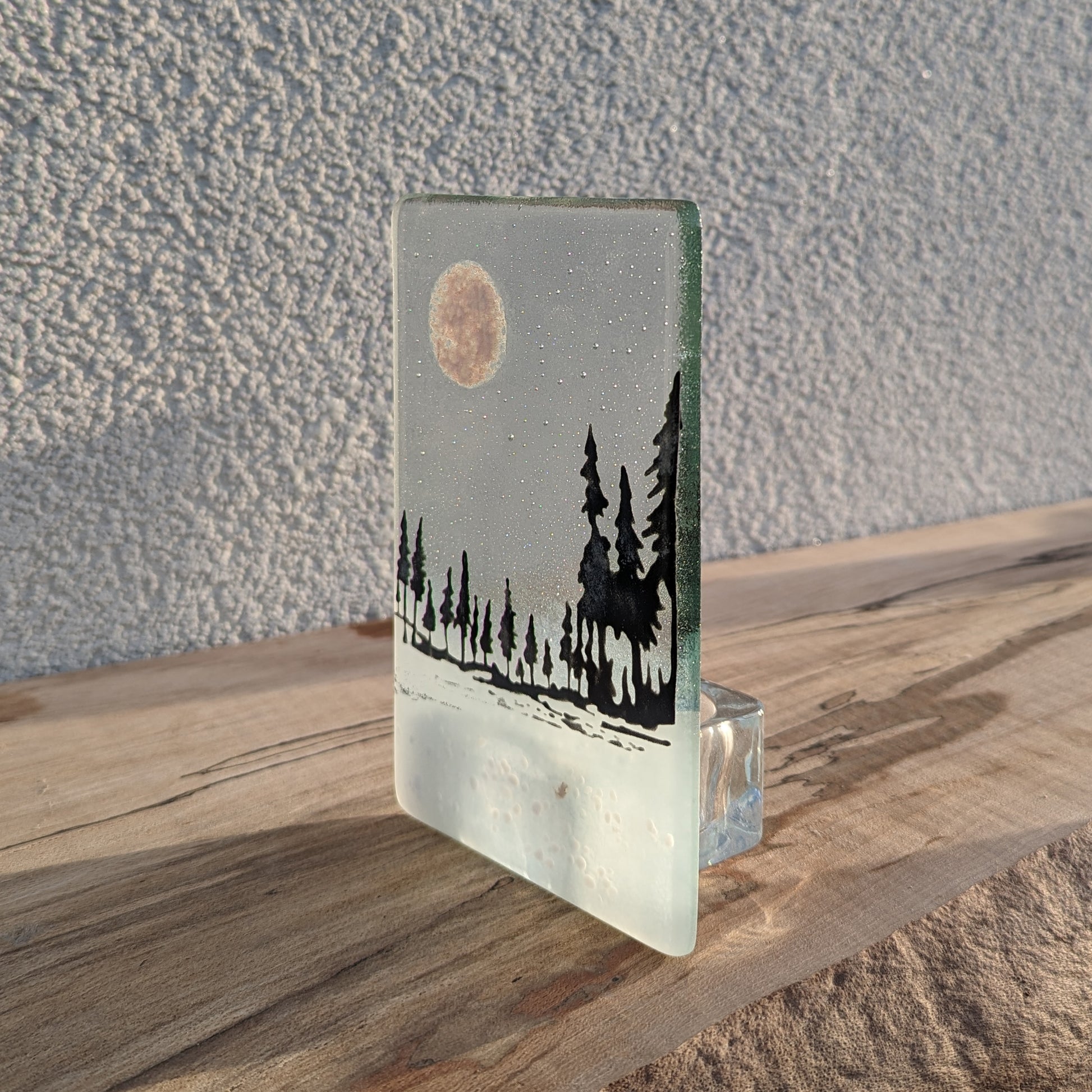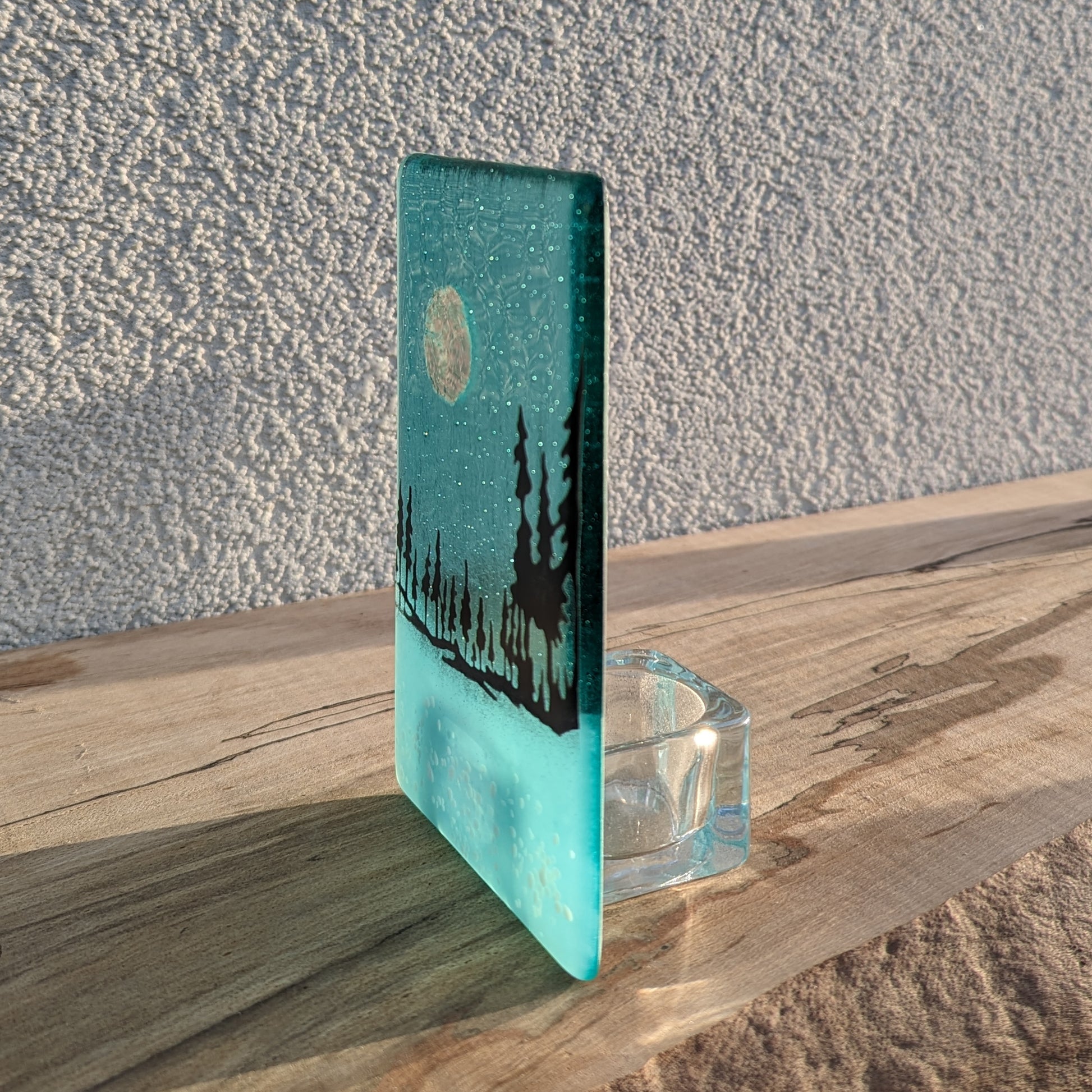 Hand drawn black tree image on a transparent blue or clear glass. Incorporating a round mica moon and white glass powders. Grinded edges for a smooth touch and sandblasted along the base. A clear candle holder is fixed to the back.