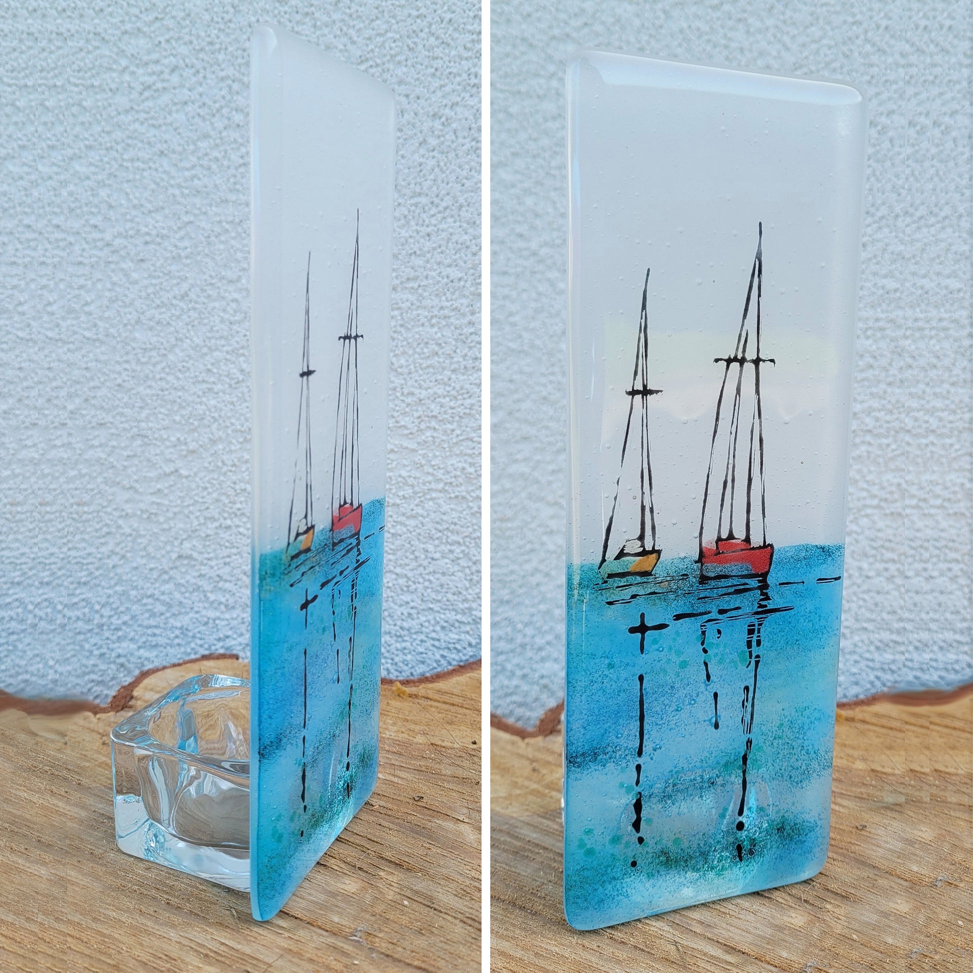 Hand drawn sailing boat image on clear glass. Incorporating coloured glass powders and frits. Grinded edges for a smooth touch and sandblasted for a frosted effect on the back. A clear candle holder is fixed to the back and then fixed to a tile base.