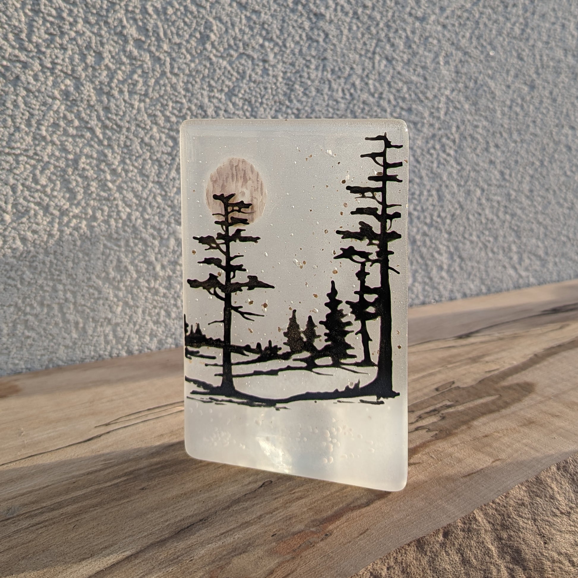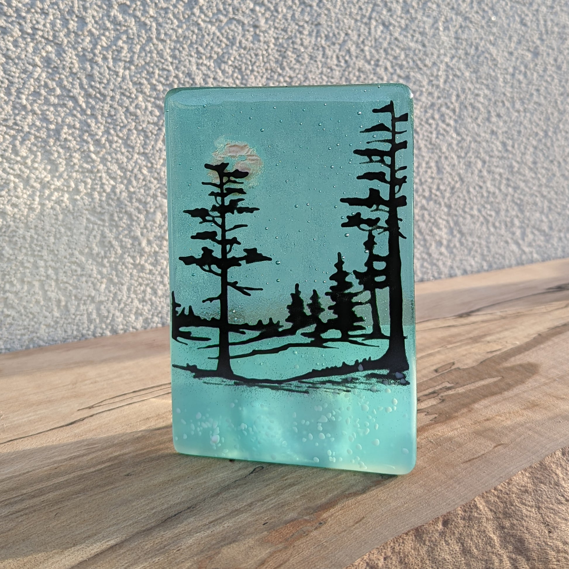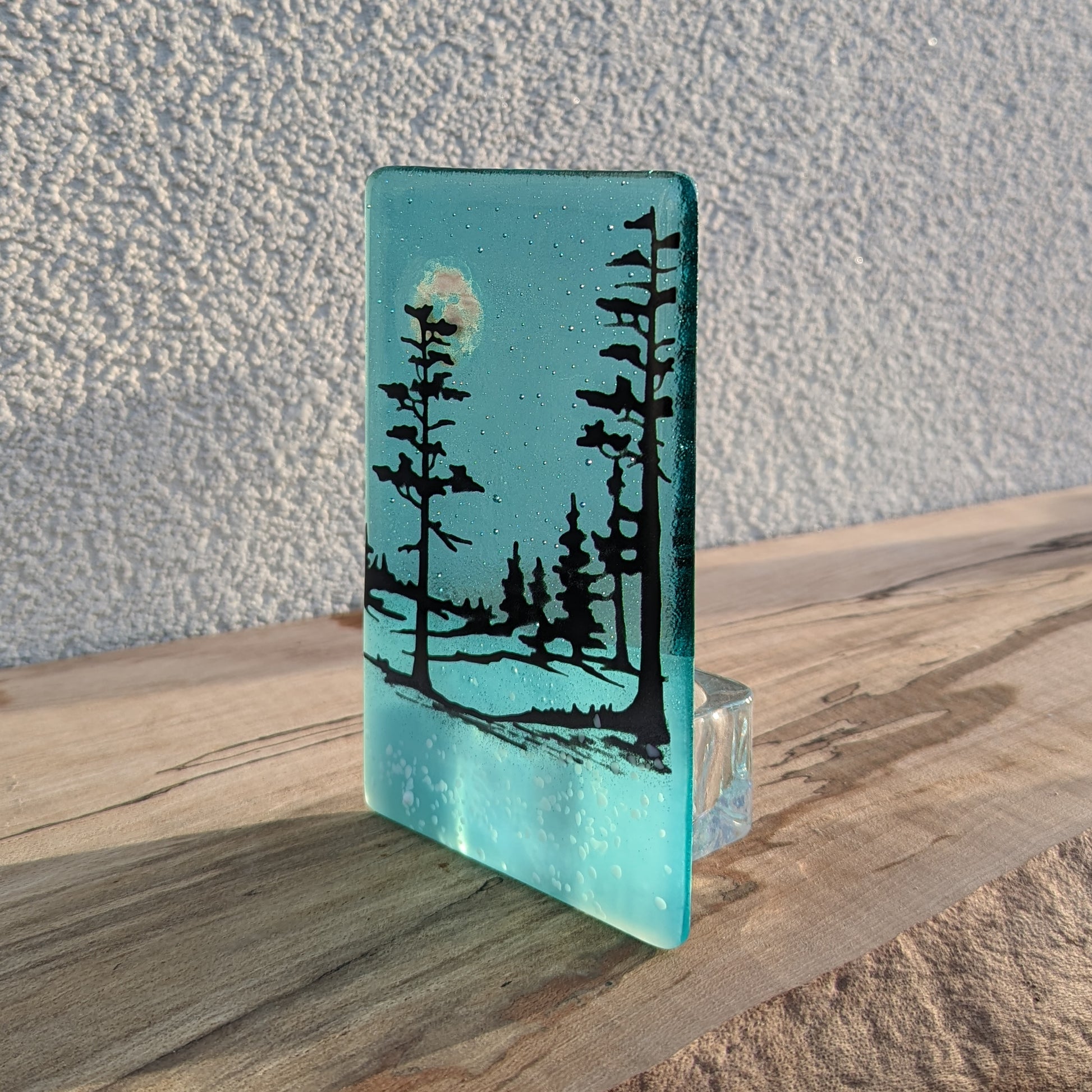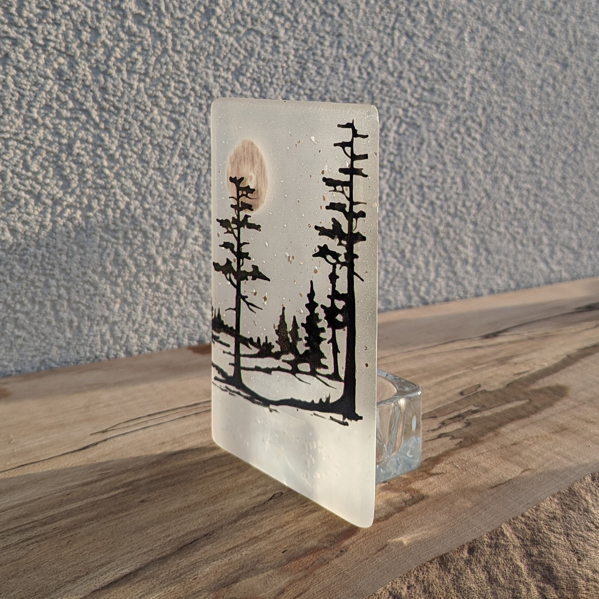 Hand drawn black tree image on a transparent blue or clear glass. Incorporating a round mica moon and white glass powders. Grinded edges for a smooth touch and sandblasted along the base. A clear candle holder is fixed to the back.