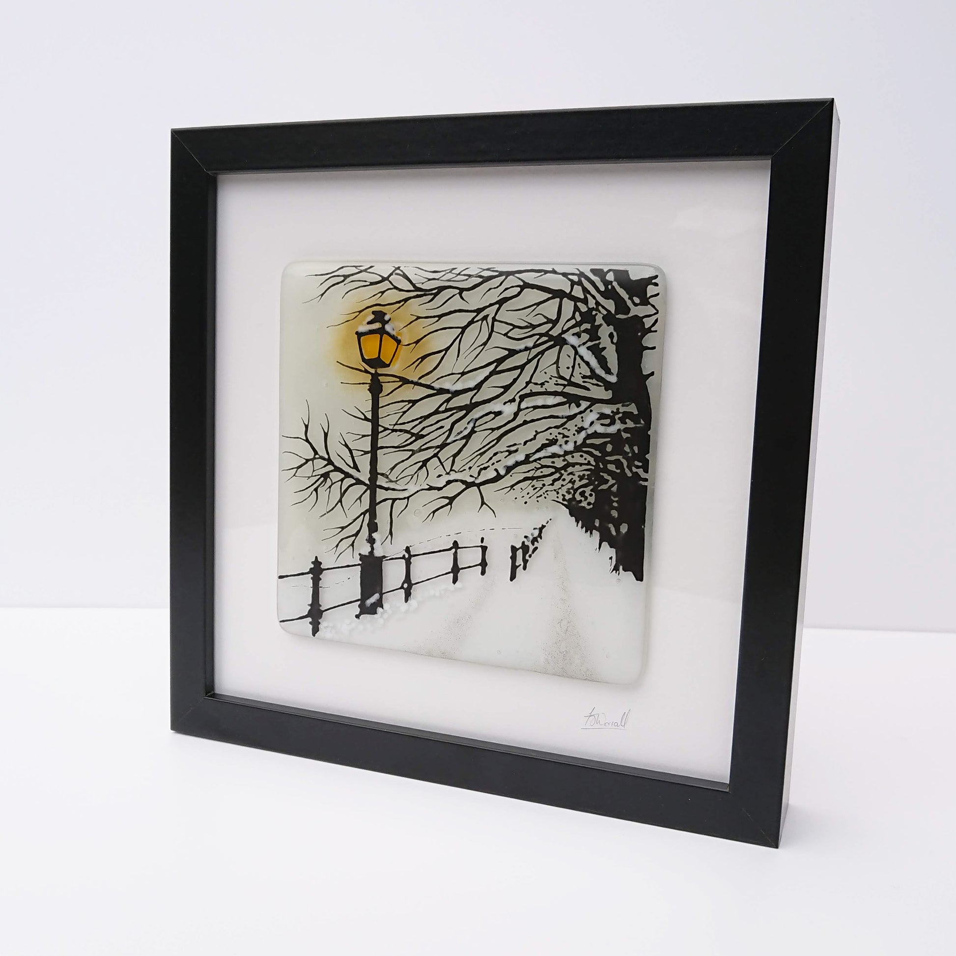 Enough coloured glass powders are incorporated to create an opaque image. The glass is sandblasted on the back with ground edges for a smooth touch. The fused glass is securely fixed to a backing glass fitting the frame, you will not see any specialised adhesive used. Frame 23x 23cm, fused glass piece approx 15x 15cm.