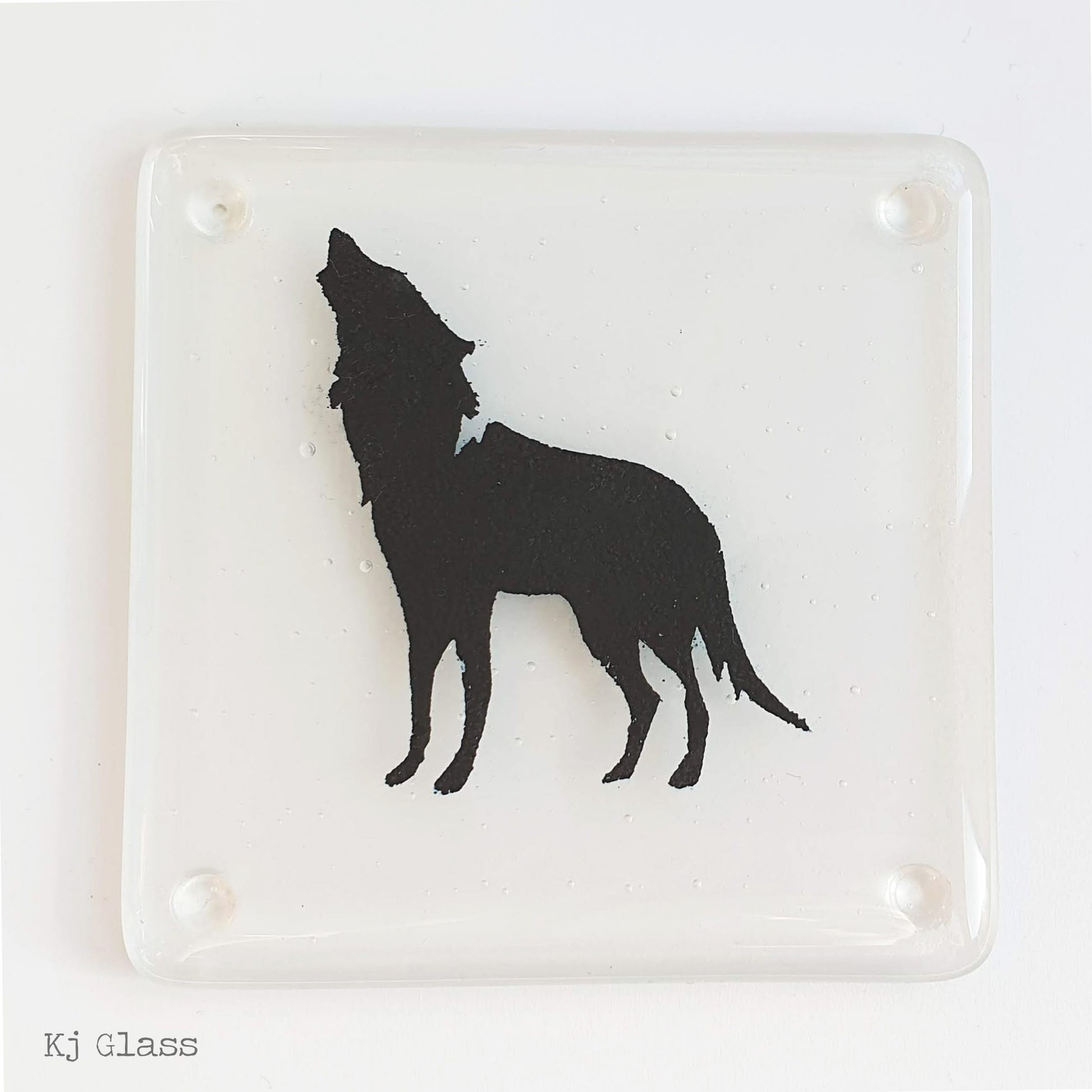 Slightly textured black Wolf on clear specialised glass. The glass is sandblasted on the back with ground edges for a smooth touch. Comes complete with those all important bumpers to protect any surface. Due to bumpers this product is not ideal for dishwashers. Hand washing is advised. (Single coaster)